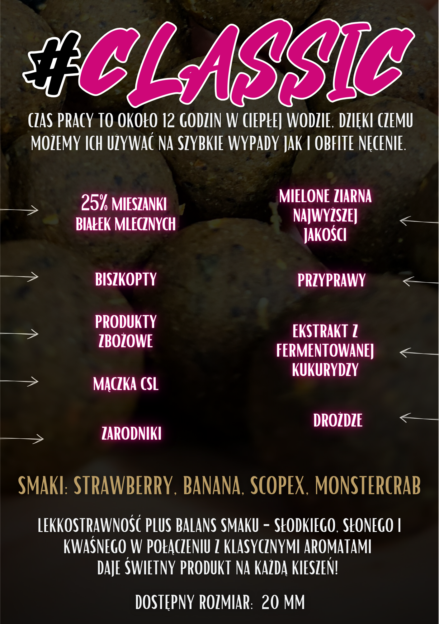 Lekkostrawność, oraz zachowany balans smaku – słodkiego, słonego i kwaśnego w połączeniu z klasycznymi aromatami daje świetny produkt na każdą kieszeń! Czas pracy to około 12 godzin w ciepłej wodzie, dzięki czemu możemy używać ich na szybkie wypady, jak i na obfite nęcenie. Seria CLASSIC występuje w kilku klasycznych aromatach: Truskawki, banana, scopexu, ananasa i kraba w rozmiarze 20 mm. Do tej serii mamy słodkie liquidy w klasycznych zapachach.