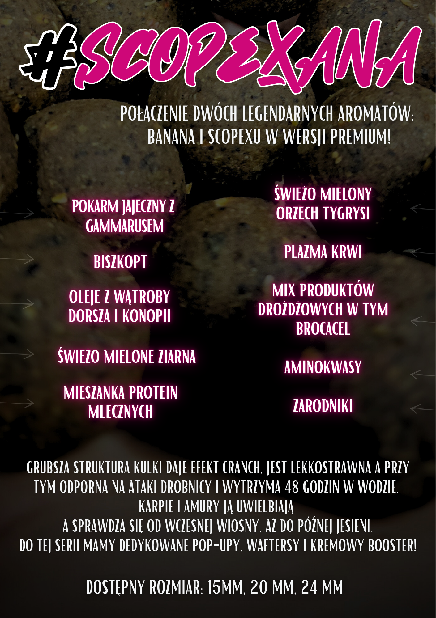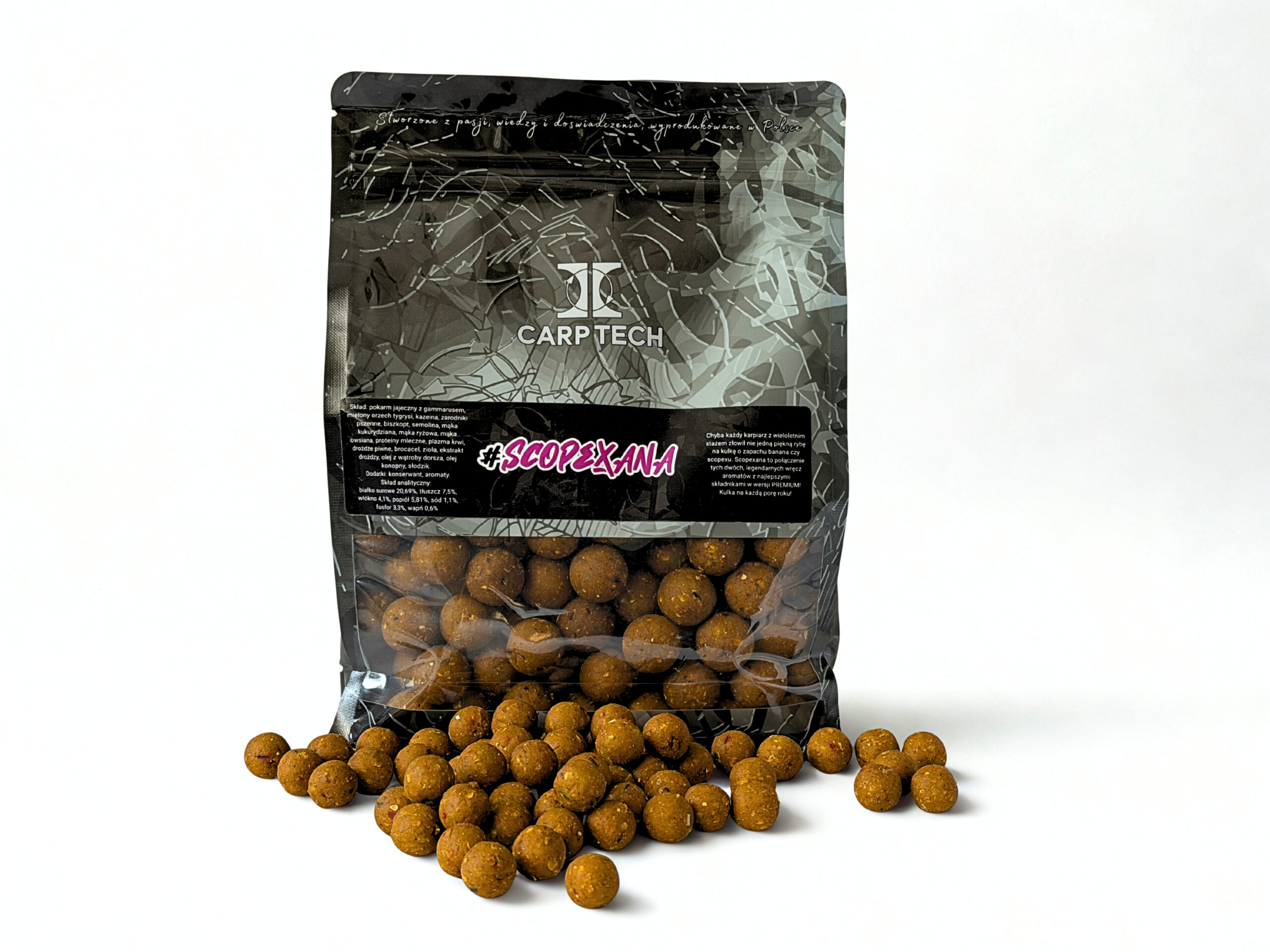 Chyba każdy karpiarz z wieloleletnim stażem złowił nie jedną piękną rybę na kulkę o zapachu banana czy scopexu. Scopexana to połączenie tych dwóch legendarnych wręcz aromatów z najlepszymi składnikami!